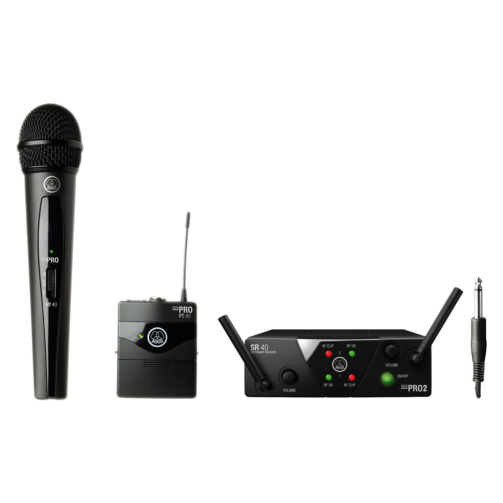 AKG WMS40 Mini Dual Vocal Instrumental Set perfectly designed to offer a genuine Plug'n'Play wireless solution. It comes with a PT40 Mini body-pack transmitter that gives a professional 3pin mini XLR connector, fit with bass and guitar levels, instrumental and headsets mics. It also features an HT40 Mini handheld transmitter that has a dynamic cardioid capsule for the highest gain before feedback. Their incredibly long battery life of 30 hours off a single AA battery keeps money in day-to-day use. Plus its receiver gives two balanced outputs via 1/4 inch jack connectors.